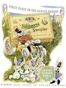 The failure to make a second Xmas out of Easter was not for lack of trying, as a perusal of Google’s online archive of midcentury Life magazines will show. Easter-themed advertising pops up every spring. Clothing gets a big push—gotta look good for that parade!—as do Whitman’s chocolates (right: “A woman never forgets the man who remembers”) and seasonal foods like Armour ham. (Or just ham in general.)